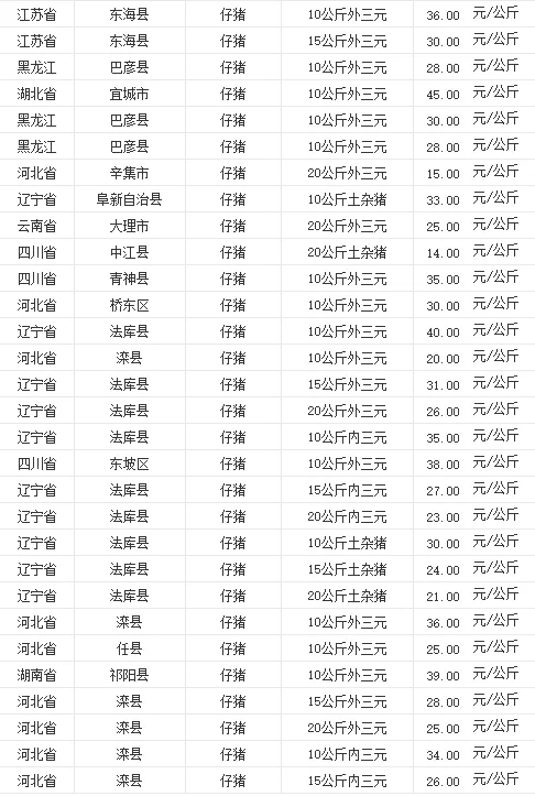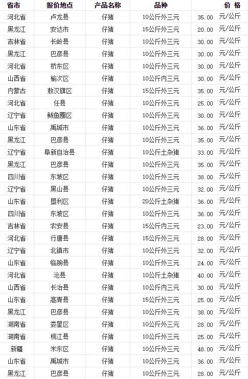 全国部分地区今日猪苗价