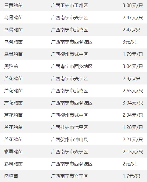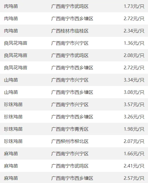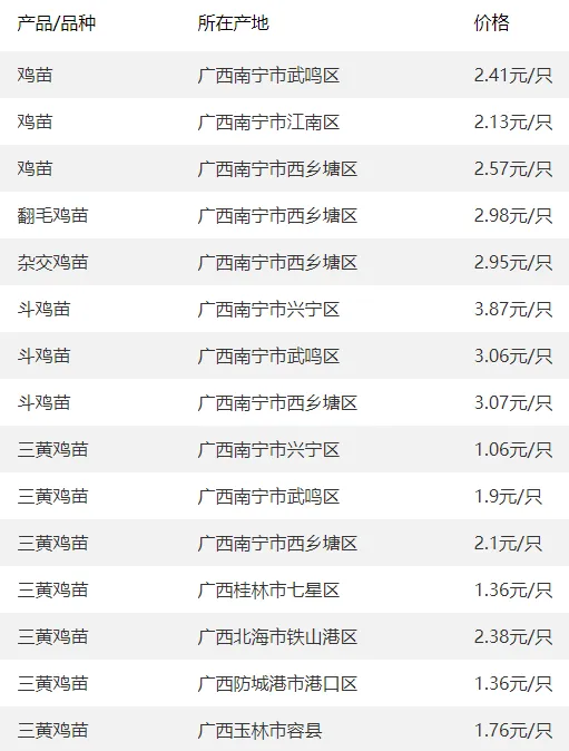 广西部分地区鸡苗价格