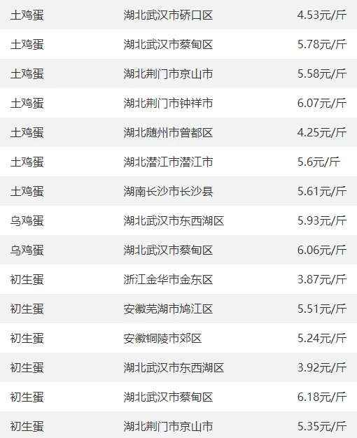 全国部分地区鸡蛋价格