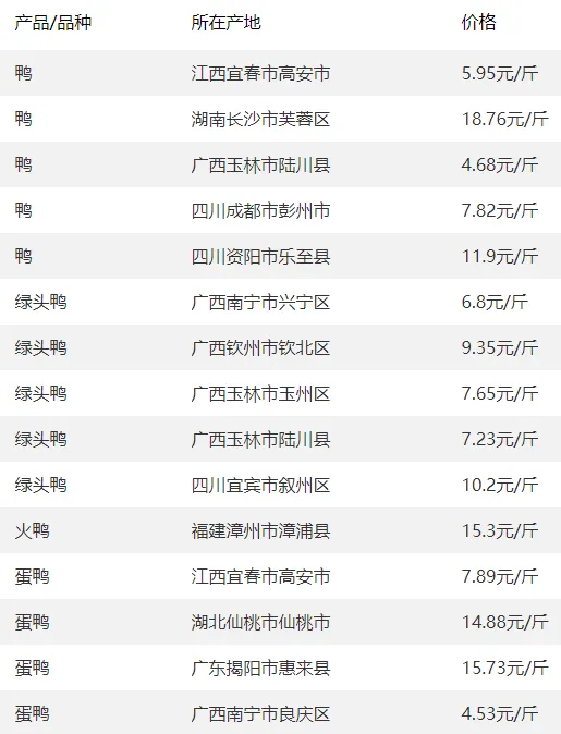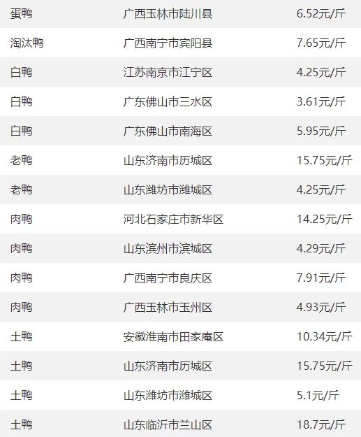 全国部分地区鸭的价格参考?