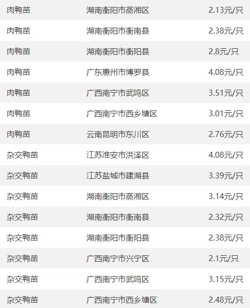 全国部分地区鸭苗价格参考