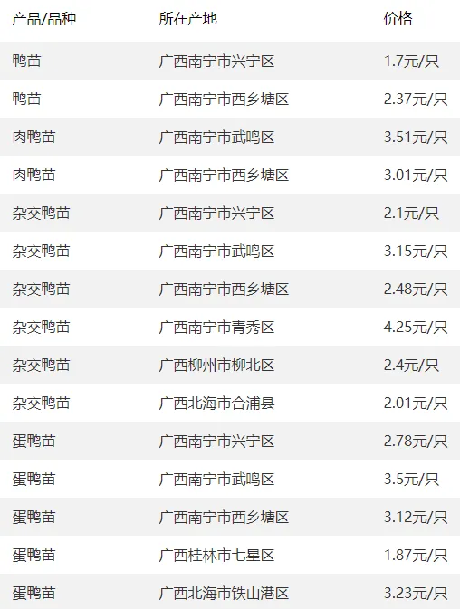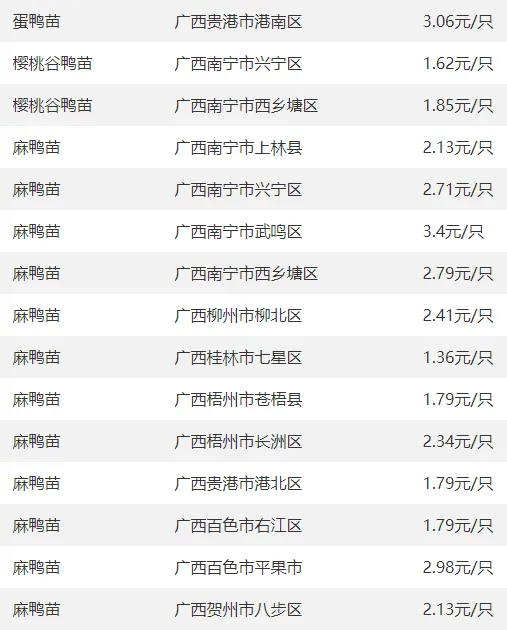广西部分地区鸭苗价格参考
