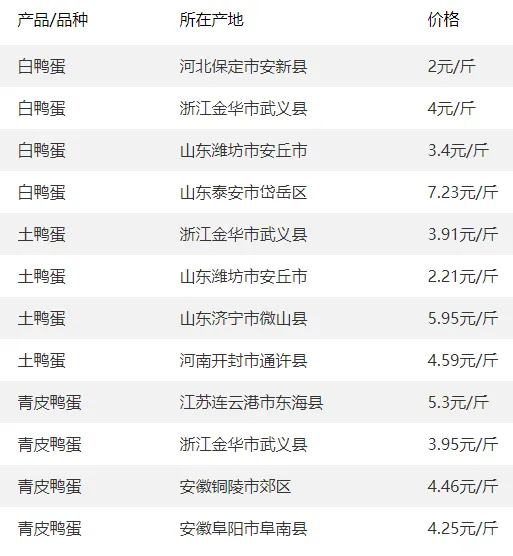 全国部分地区鸭蛋价格参考