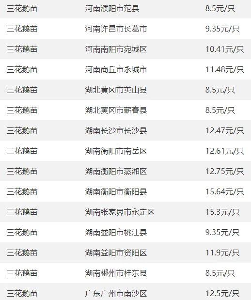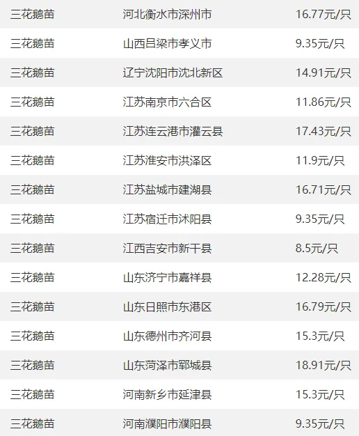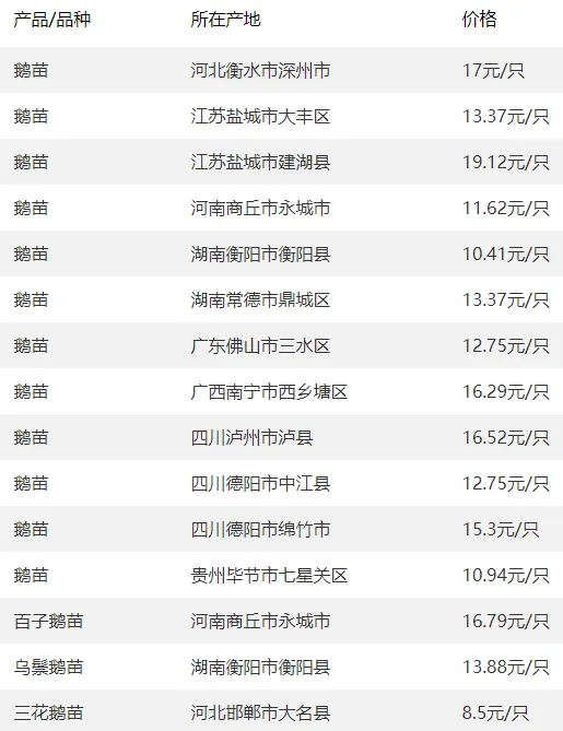 全国部分地区鹅苗价格参考