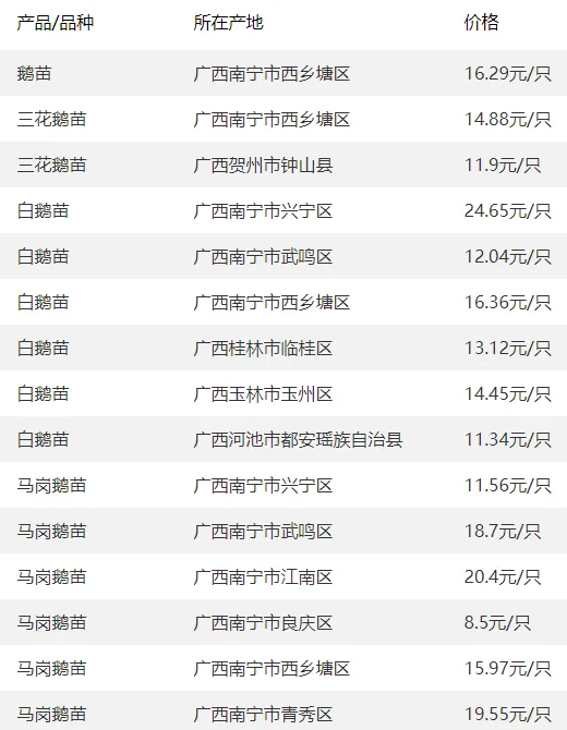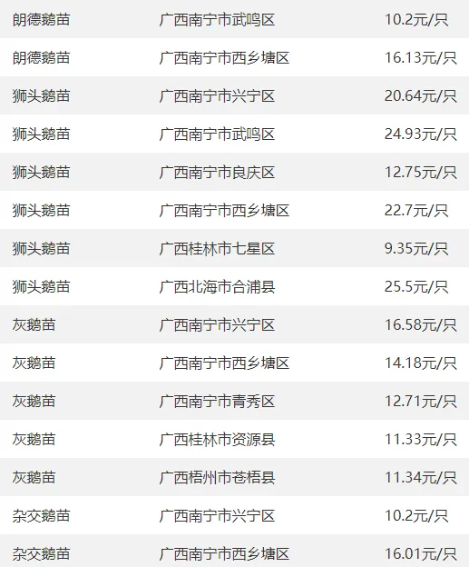 广西部分地区鹅苗价格参考