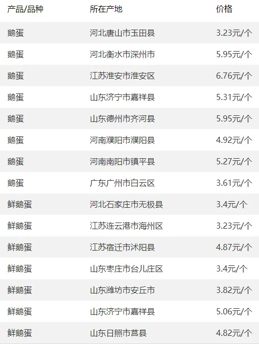 全国部分地区鹅蛋价格参考