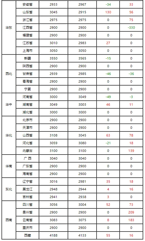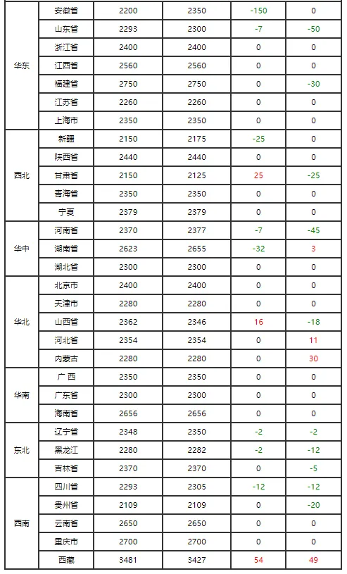 贵州 | 10.75↓ | 13.00↓ | 12.50↓ |