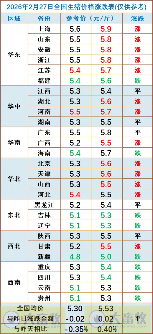 大畜牧小编根据我国27省的猪价数据,计算出2026年2月27日全国平均猪价为每斤5.42元,与昨天一样;