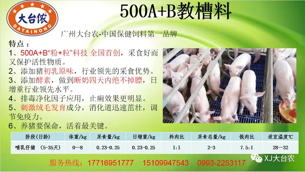 4、初乳:仔猪出生后6到12个小时需要吃足够的初乳。仔猪的免疫系统还没有发育成熟,所以它们的抵抗力主要依赖于初乳中的免疫球蛋白。母猪带的仔猪数不要超过有效乳头数。初产母猪的带仔数可以限制在10头。14天后开始补教槽料。