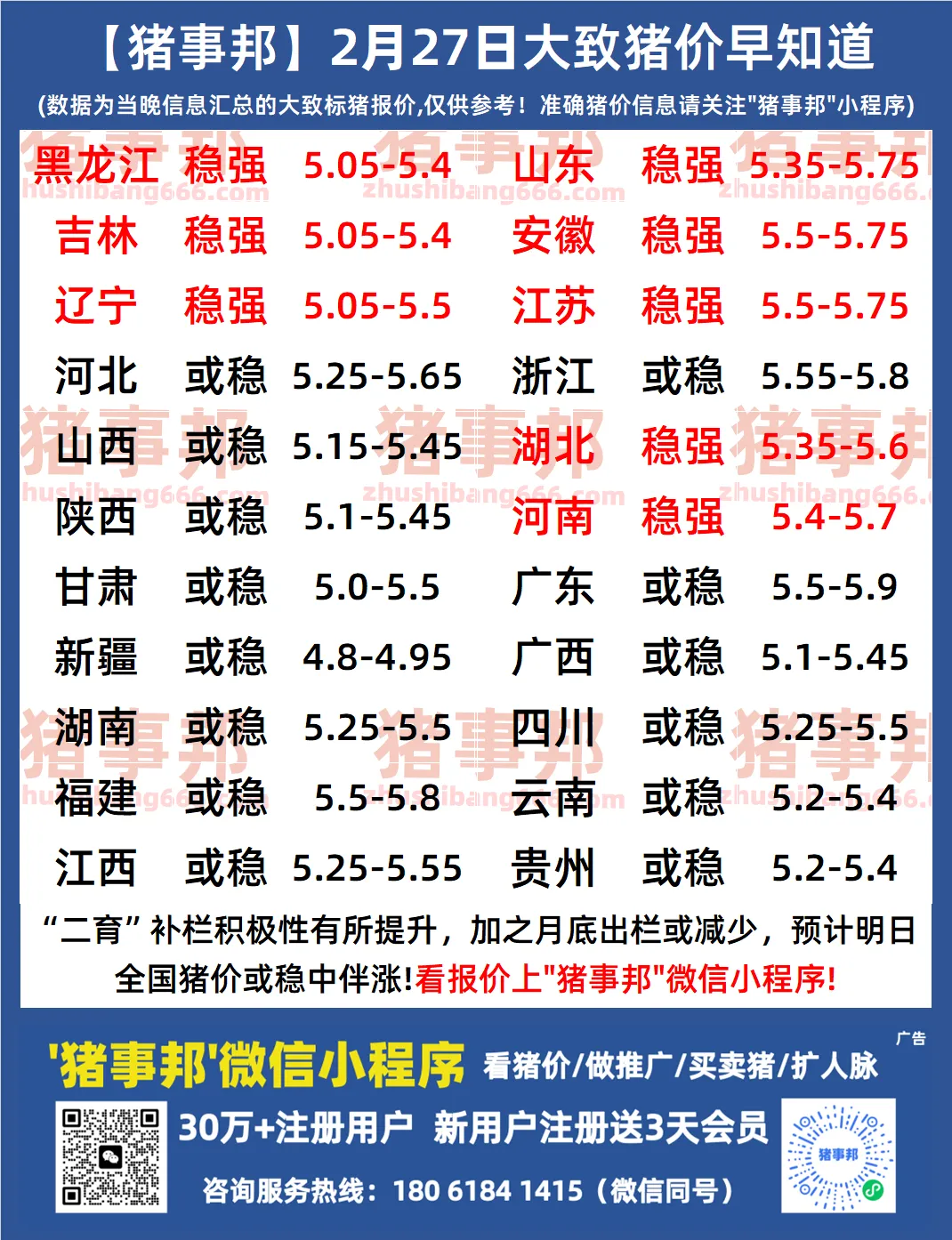 猪事帮|| 2月27日猪价早知道(或稳中伴涨!)