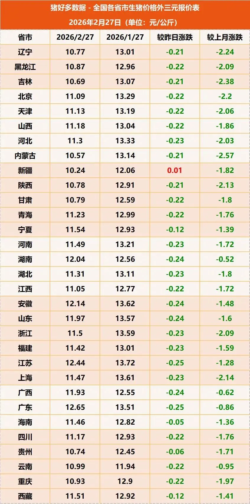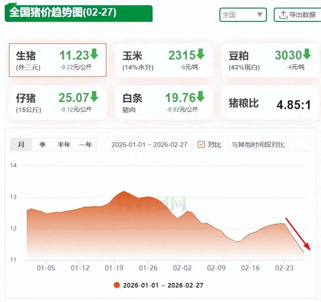 节后猪价大幅下跌近乎“崩盘”!据猪好多数据监测显示,2026年2月27日全国外三元生猪均价为11.23元/公斤,较昨日再跌0.22元/公斤,猪价4天大跌0.92元/公斤,且仍未显露出明显的止跌迹象。这也进一步加剧了养殖户对于后市信心的不足,当前养殖端空栏观望现象增多。
