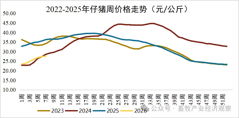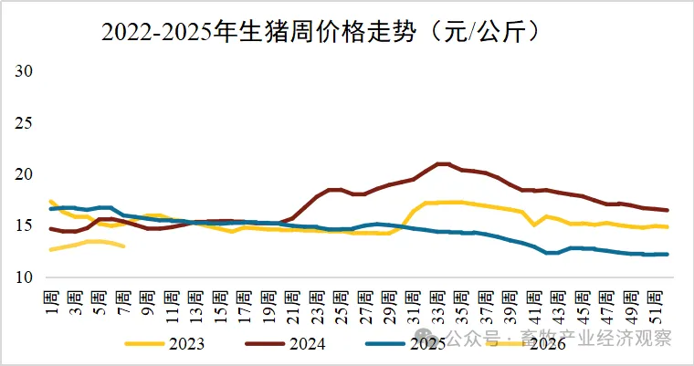2月第2周的生猪数据,每一个数字都透着养殖端的无奈:生猪价格跌幅较前期进一步扩大,西南产区13.67元/公斤的均价成了全国最高,却仍难掩全行业的低迷;猪肉价格也终结了短暂的上涨趋势,23.80元/公斤的均价环比微跌0.3%,即便华南消费旺区卖到26.75元/公斤,东北产区却仅20.22元/公斤,区域价差进一步拉大;就连仔猪价格,看似0.6%的环比上涨,也只是涨幅收窄后的“虚涨”,27.56元/公斤的均价同比大跌24%,直接反映出养殖端补栏意愿的持续低迷。而这一切的背后,是自2025年9月以来,自繁自养头均亏损超10周的现实,行业周期底部的煎熬,还在继续。