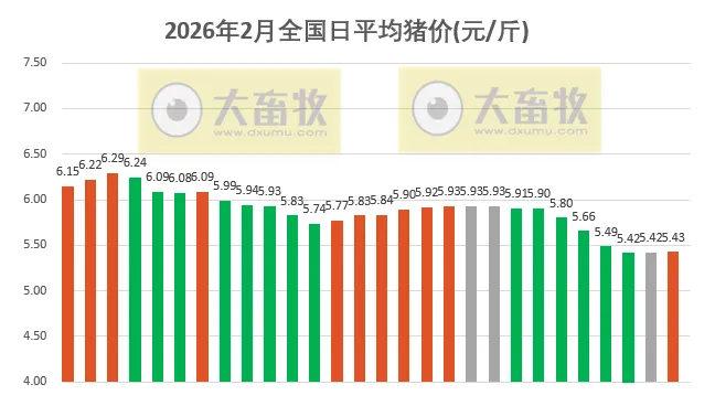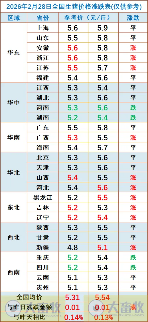 大畜牧小编根据我国27省的猪价数据,计算出2026年2月28日全国平均猪价为每斤5.43元,比昨天上涨0.01元,涨幅为0.14%,小幅上涨;