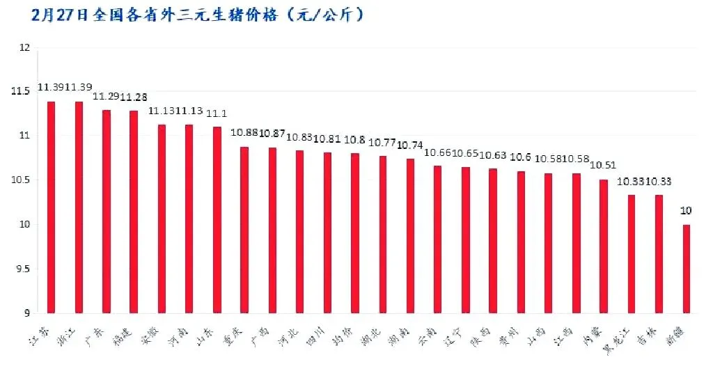 今天全国外三元生猪出栏均价为10.8元/公斤,较昨日上涨0.06元/公斤,最低价新疆10元/公斤,最高价江苏11.39元/公斤。