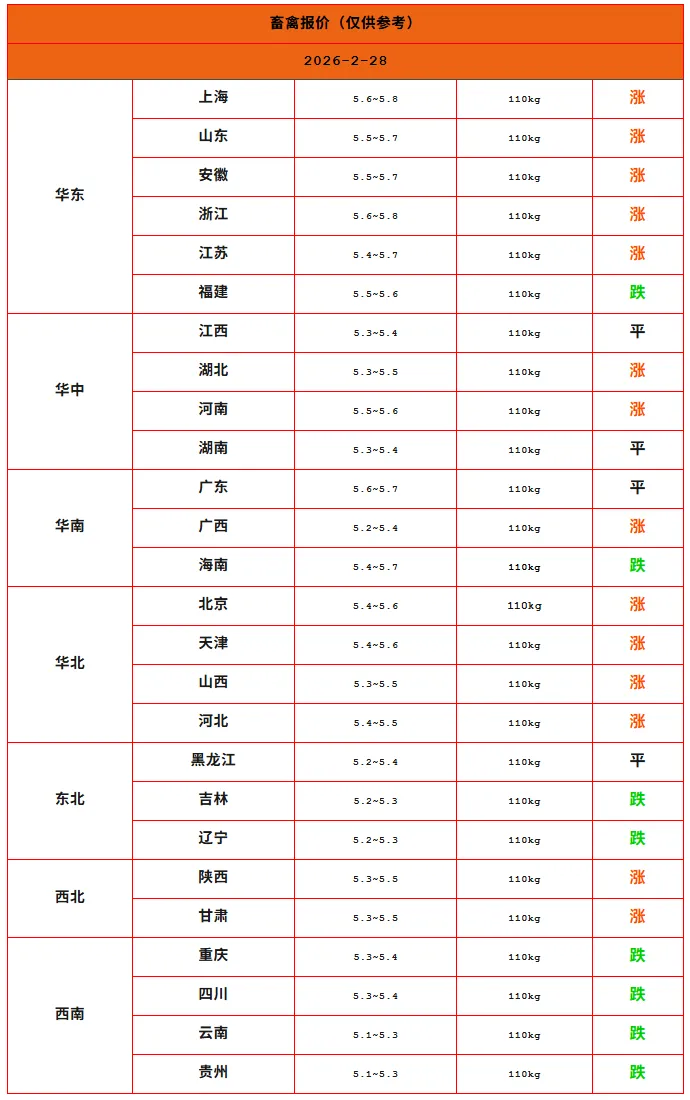2026年02月28日全国猪价行情表 养羊网 2026-02-27 2026年02月28日全国猪价行情表以上内容源于网络,如有侵权请与我们联系,将及时删除。来源丨 畜禽报价 养羊网 2026-02-27 上一篇:2月27日全国猪价涨幅走扩【动力猪价】 下一篇:2026.02.28-明天猪价(猪价上涨不要停!) 您可能还会对下面的文章感兴趣111: 相关文章 ??农场的鸡蛋?又便宜又好呀 1月8日猪价 | 稳中偏强,有猪要卖的关注大场出栏节奏! 2025年4月13日全国各地生猪价格信息 2025年4月13日全国各地生猪价格信息