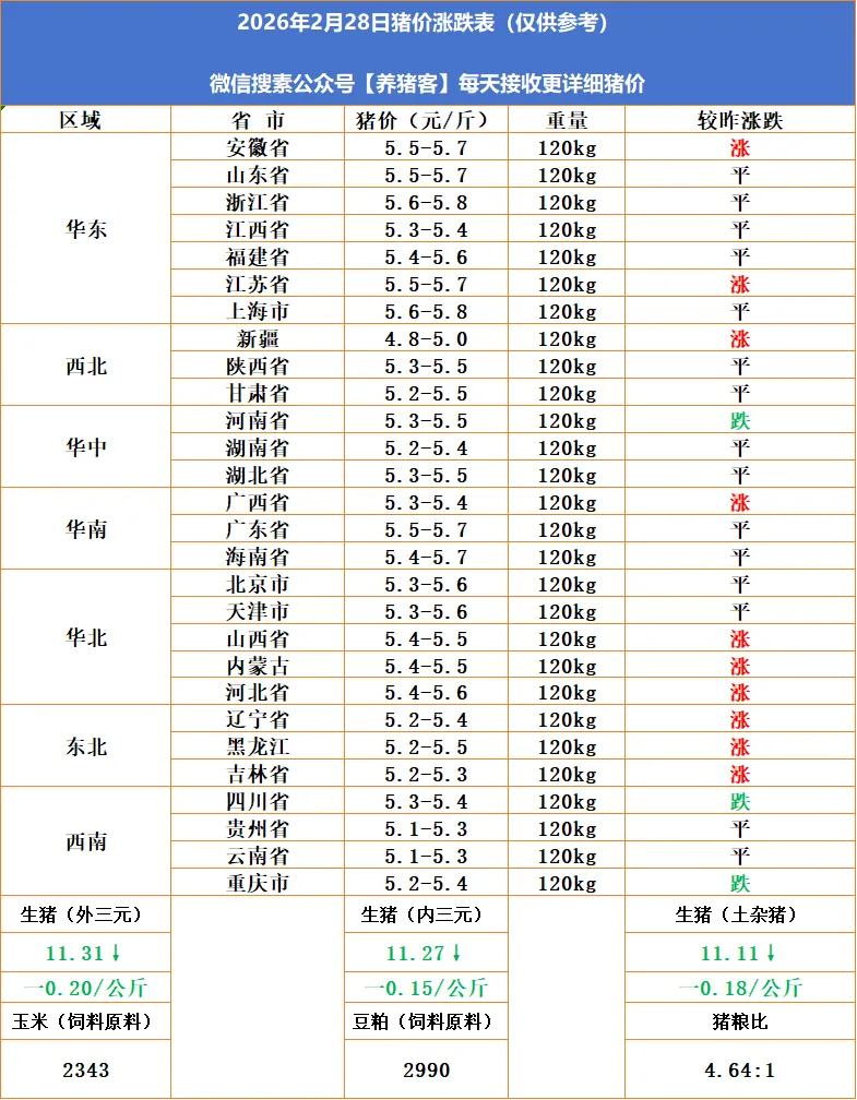 养猪客|2026.2.28|明天猪价分析(只供参考) 养羊网 2026-02-27 养猪客|2026.2.28|明天猪价分析(只供参考) 养羊网 2026-02-27 上一篇:阿斌猪价2026.02.28(多区域上涨!) 下一篇:【明天猪价】26.2. 28 涨涨涨!猪价继续上涨!! 您可能还会对下面的文章感兴趣111: 相关文章 近期价格更新!!! 猪猪?的春天要来了 2025年4月13日全国各地生猪价格信息 养羊人要时刻记住这几点!
