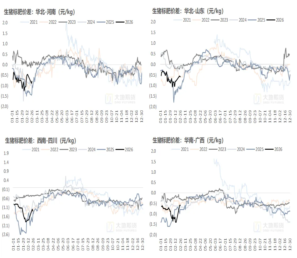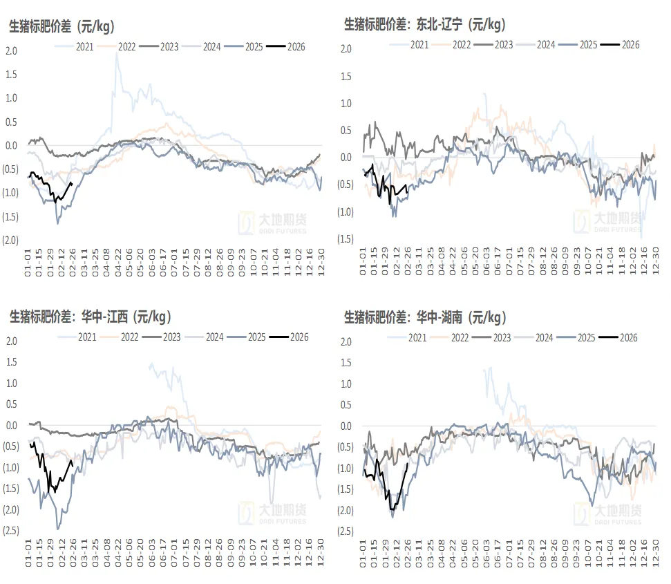 年后回来肥标价差高位有所走缩。前夕大猪出栏积极性高,整体肥标溢价较年前高位缩窄;假期回来标猪快速走弱,肥标有微幅扩大迹象。