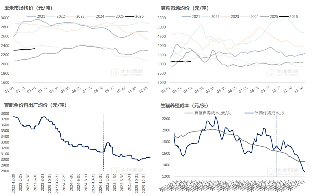 玉米:截至2月27日,玉米现货均价2330元/,较前周+12元/吨,环比+0.52%,同比+7.57%;豆粕:截至2月27日,豆粕现货均价3141元/吨,较前周+23.67元/吨,环比+0.76%,同比-14.32%。