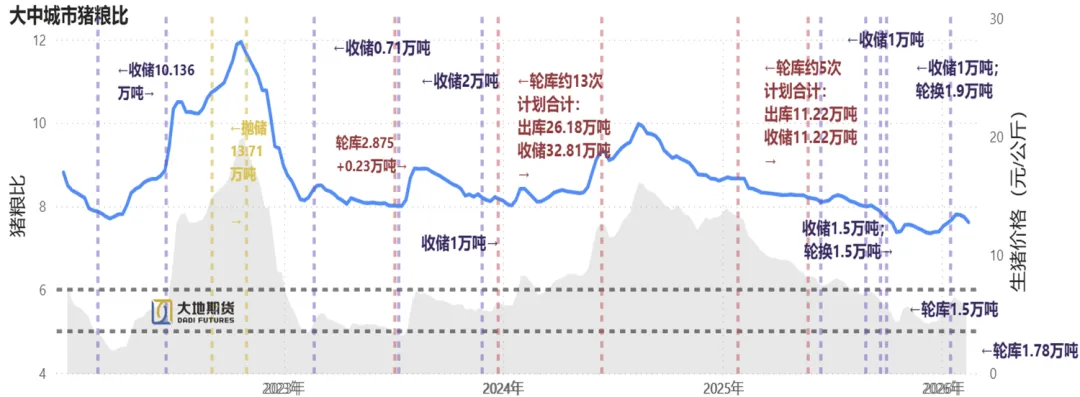 据国家发展改革委价格监测中心,截至2月11日,猪粮比价为5.50,较前周环比-3.17%,主要受猪价承压走弱影响。猪粮比近几个月持续处在5:1至6:1之间,触及猪肉储备二级预警区间。
