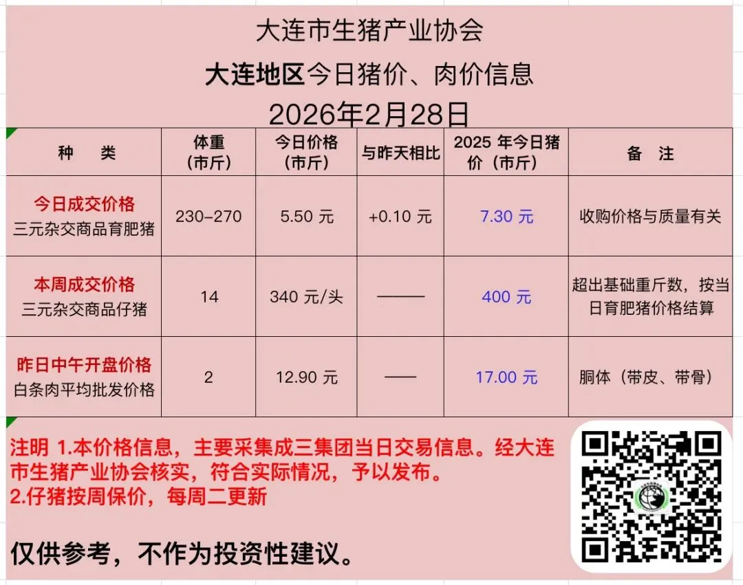 2026 年 2 月 28 日猪价、肉价信息 养羊网 2026-02-28 2026 年 2 月 28 日猪价、肉价信息天天报价大连市生猪产业协会 养羊网 2026-02-28 上一篇:二育观望情绪浓厚,未来猪价怎么走? 下一篇:大众报价:2026.02.28全国猪价 您可能还会对下面的文章感兴趣111: 相关文章 明天猪价2026年2月6日 2025年4月13日全国各地生猪价格信息 鸡蛋打爆一起小散 33r的鸡蛋,比超市便宜,包装还完好