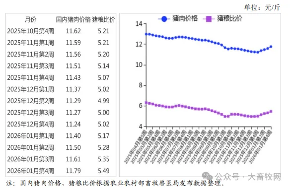 【后期走势】 养殖场户积极出栏生猪,猪肉供给充裕。 春节备货明显提振猪肉消费,将带动春节前猪肉价格温和上涨。 春节过后短时间内,餐饮企业和消费者主要以消费库存为主,生猪及猪肉价格或面临阶段性下行风险。 【详情】 (一)仔猪、生猪及猪肉价格普遍上涨。 从供给看,生猪养殖户和规模养殖场看涨后市行情,压栏增重情绪增强,生猪价格明显上涨。 需求方面,元旦过后东北、华北、华东地区猪肉消费出现短时小幅下降,随着气温持续降低,北方灌肠制作数量增多,西南地区腌腊制作持续进行,多数批发商、经贸商、食品加工企业及餐饮企业增加猪肉采购备货量。 能繁母猪数量和仔猪供应量减少,规模养殖场看涨下半年生猪市场行情,部分开始采购仔猪,支撑仔猪价格上涨。 据农业农村部数据,2025年1—12月累计,规模以上生猪屠宰企业屠宰量4.11亿头,同比增18.3%,其中,2025年12月份屠宰量4891万头,环比增23.6%,同比增11.2%。 2025年12月份能繁母猪存栏环比减0.4%,同比减2.9%。 2026年1月份猪肉集贸市场价为每公斤23.93元,环比涨5.9%,同比跌14.2%;生猪集贸市场价每公斤12.98元,环比涨6.7%,同比跌21.9%;仔猪集贸市场价每公斤23.93元,环比涨2.3%,同比跌29.6%。 (二)猪粮比价提高。 生猪价格涨幅大于玉米价格涨幅,猪粮比价提高,但仍处于盈亏平衡点以下。 据国家发展改革委监测,1月份猪粮比价为5.59:1,比上月提高0.37个点。 2026年1月份全国饲用玉米价格为每公斤2.44元,环比涨0.4%,同比涨7.0%; 育肥猪配合饲料价格为每公斤3.36元,环比持平,同比涨0.3%。 (三)2025年猪肉进口量额均减,出口量额均增。 据海关统计,2025年12月份我国进口冷鲜冻猪肉5.64万吨,环比减7.2%,同比减38.5%; 进口额1.10亿美元,环比减6.7%,同比减44.1%; 出口量0.69万吨,环比增32.0%,同比增1.1倍; 出口额0.23亿美元,环比增27.2%,同比增35.9%。 进口猪杂碎9.16万吨,环比基本持平,同比减12.8%; 进口额1.83亿美元,环比减6.0%,同比减24.1%。 2025年1—12月累计,进口冷鲜冻猪肉97.68万吨,较上年减9.0%; 进口额19.76亿美元,较上年减8.2%; 出口量4.54万吨,较上年增64.0%; 出口额1.70亿美元,较上年增37.4%; 贸易逆差18.07亿美元,较上年减11.0%。 进口猪杂碎118.17万吨,较上年减2.4%, 进口额25.19亿美元,较上年减5.5%。 (四)美国猪肉价格止涨回落,欧盟猪肉价格持续下跌。 美国圣诞、元旦等节日过后,猪肉消费短时回落,价格止涨回落。 2026年1月份,美国猪肉切块批发价格为每英担93.00美元,环比跌3.6%,同比涨1.8%; 51%—52%瘦肉猪价格为每英担61.00美元,环比跌0.8%,同比涨3.4%。 欧盟猪肉产量增长、出口受阻、消费需求不足的情况持续,猪肉市场价格连续6个月下跌。 欧盟猪肉批发价格每吨1508.42欧元,环比跌5.8%,同比跌17.9%。 (五)预计春节前猪肉价格温和上涨,节后短时回落。 从生产端看,前期压栏肥猪在春节前陆续上市,生猪及猪肉供应充裕。 从消费端看,春节备货需求明显增加,终端消费需求集中释放,将带动生猪及猪肉价格上涨,涨幅有限。 春节过后,消费需求阶段性短时回落,价格面临季节性下行风险。 来源: 农业农村部市场与信息化司