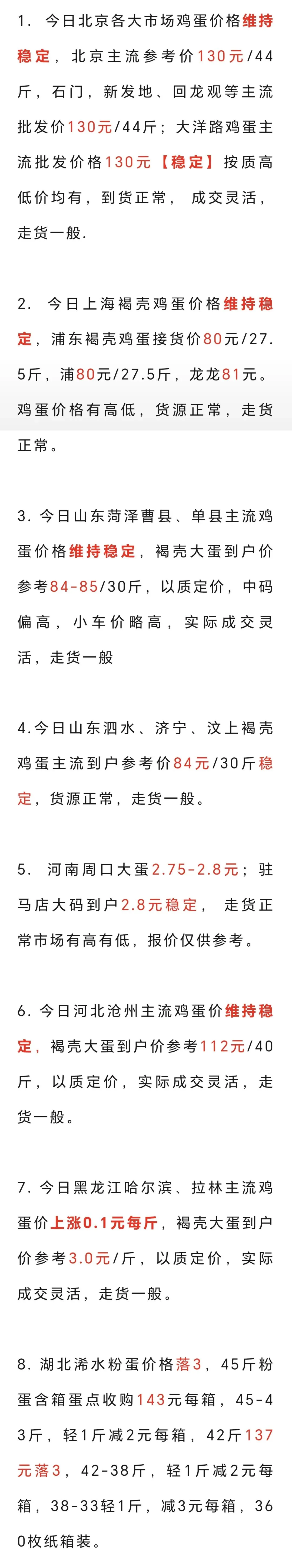 2026年2月28日各地鸡蛋价格 养羊网 2026-02-28 2026年2月28日各地鸡蛋价格 养羊网 2026-02-28 上一篇:明日(2026年3月1)鸡蛋价格预测 下一篇:2026年2月28日山东鸡蛋价格实报 您可能还会对下面的文章感兴趣111: 相关文章 2025年4月13日全国各地生猪价格信息 1块6的土鸡蛋算贵吗? 【超前猪价大预测】2月21~2月24日全国猪价! 河南·南阳硕宝合作社鸡蛋价格[2026年1月24日]