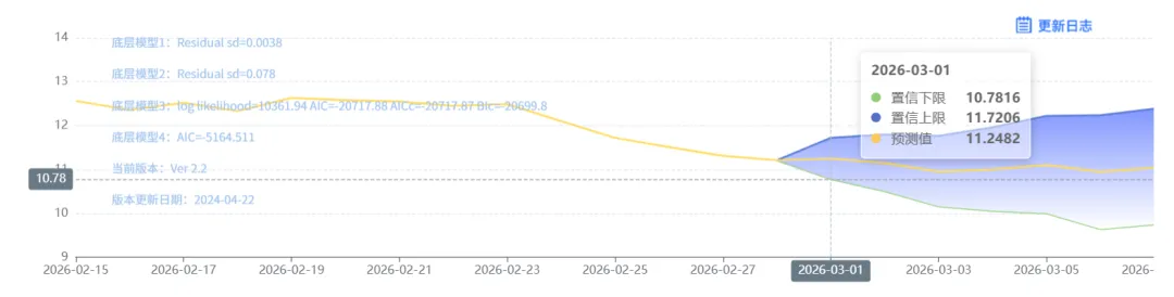 玄田算法是由项目课题组团队原创的非经典逻辑数值聚合理论和不确定性预测方法,构建了基于一致模算子的生猪价格预测模型。该模型采用的聚合函数及一致模相关理论与方法已获得多项国家自然科学基金和省级自然科学资金资助,并获得多项省级自然科学奖奖项。03月01日预测猪价为11.2482,置信区间在10.7816--11.7204之间。03月02日预测猪价为11.1446;03月03日预测猪价为10.9501。