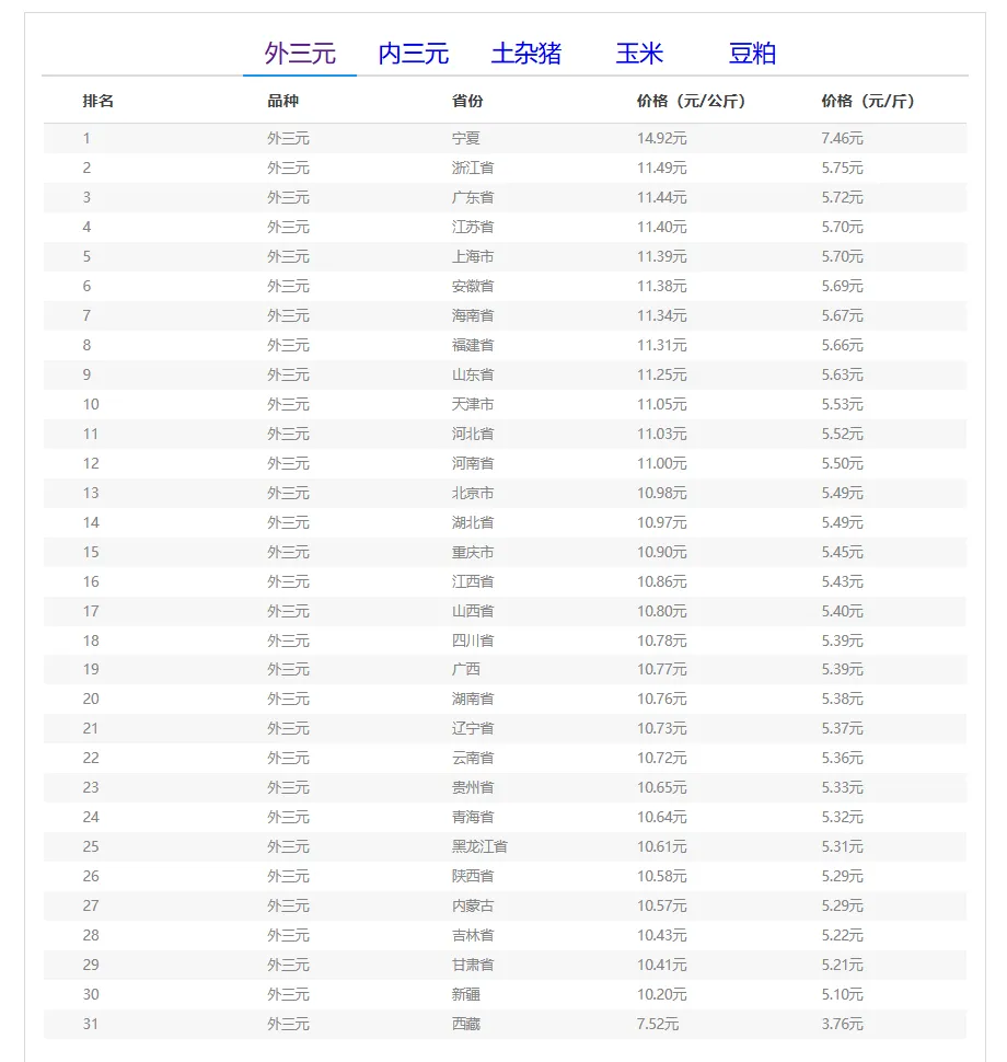 全国外三元生猪价格排行榜
