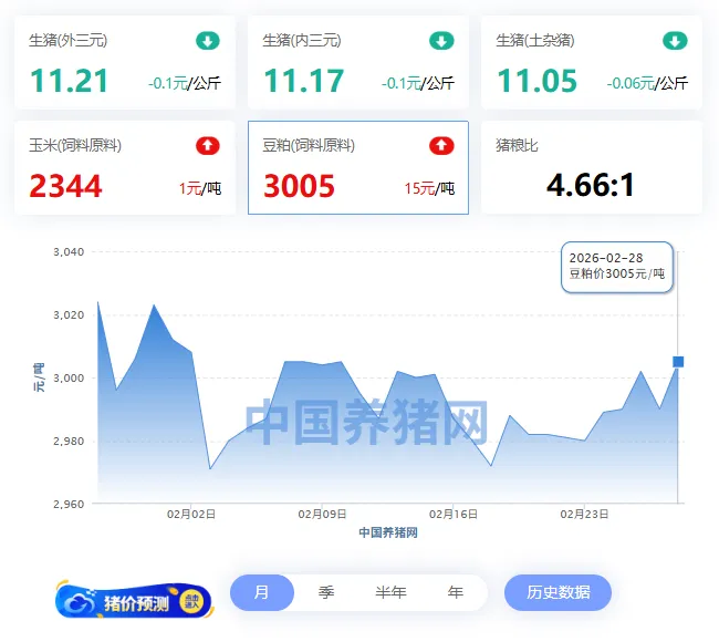 2026年02月28日-中国养猪网 全国豆粕价格走势图及涨跌表