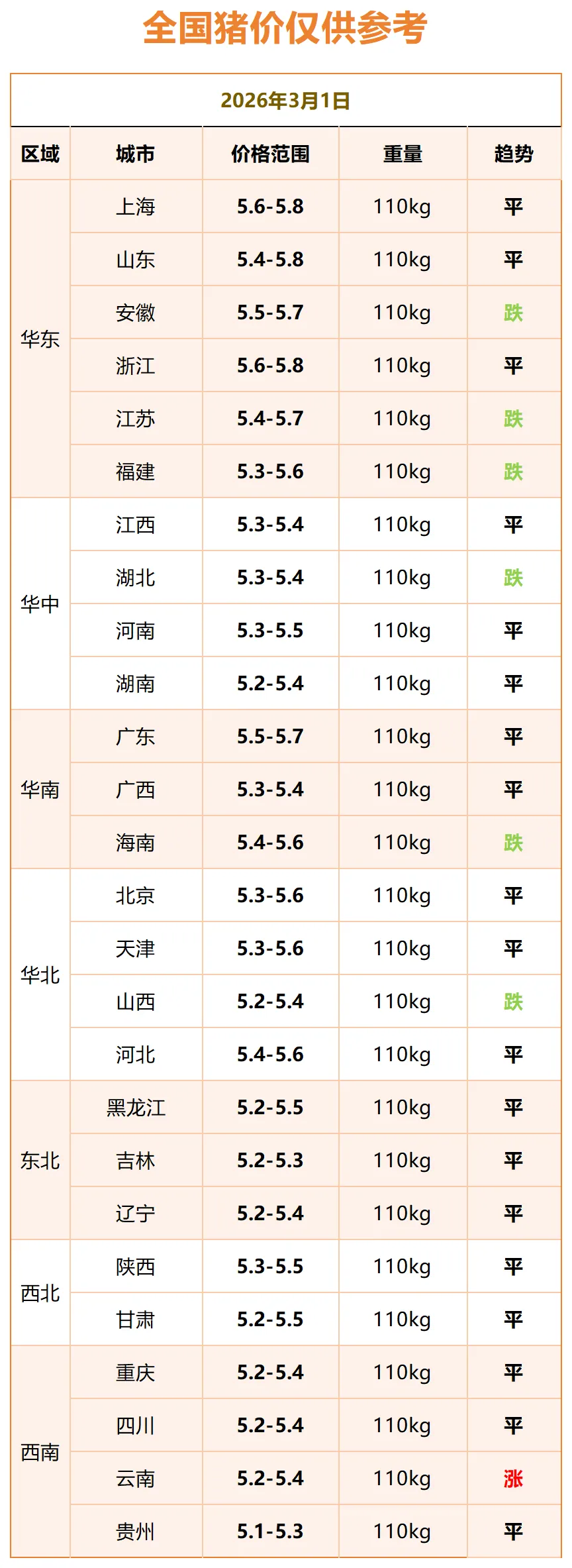 明日猪价早知道~全国大部分地区猪价持平,小部分地区猪价下跌,只有一个地区在上涨!
