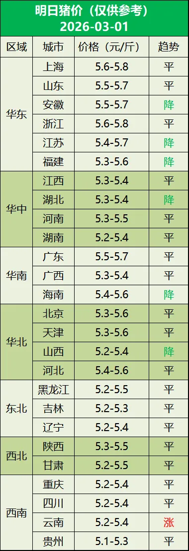 明日猪价(2026年03月01日) 养羊网 2026-02-28 明日猪价(2026年03月01日) 养羊网 2026-02-28 上一篇:3.1全国最新猪价信息 下一篇:2026.03.01-明天猪价,一夜突变,猪价再次下跌 您可能还会对下面的文章感兴趣111: 相关文章 明日最新猪价2026.01.29 蔬菜种植项目:水芹无土种植 前景好可推广 近期价格更新!!! 农村土鸡这么贵吗?
