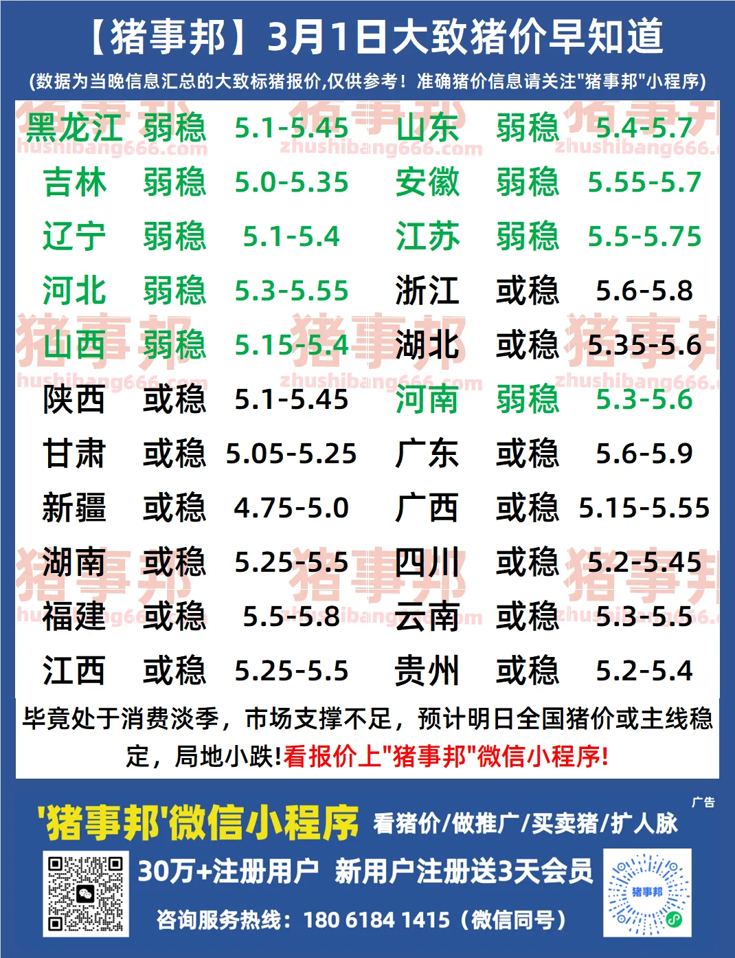 猪事帮|| 3月1日猪价早知道(或稳中稍弱!)