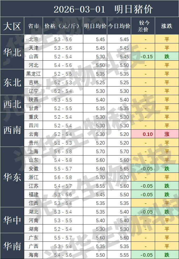 2026-3- 1全国猪价预测 养羊网 2026-02-28 2026-3- 1全国猪价预测----- 养羊网 2026-02-28 上一篇:母羊吃什么下奶多又快?养羊人必看!告别缺奶、少奶难题 下一篇:猪价一览|2026年3月1日 (明日猪价早知道) 您可能还会对下面的文章感兴趣111: 相关文章 【超前猪价大预测】2月6日~2月8日!全国猪价! 2025年4月13日全国各地生猪价格信息 近期价格更新!!! 2月11日鸡蛋价格降