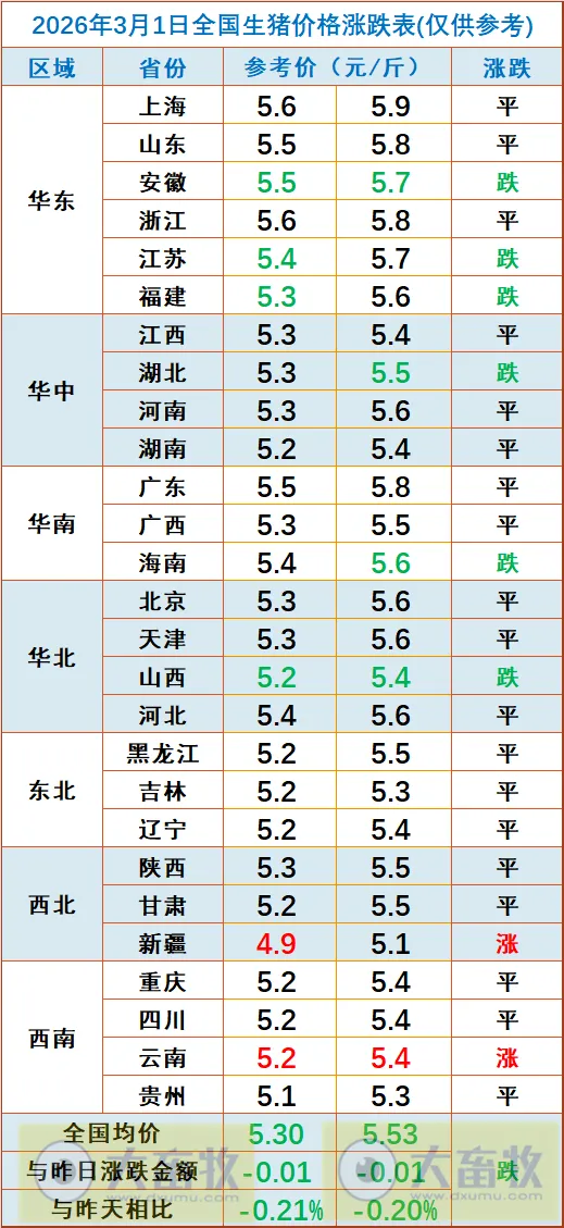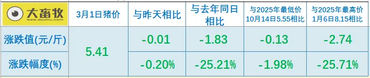 大畜牧小编根据我国27省的猪价数据,计算出2026年3月1日全国平均猪价为每斤5.41元,比昨天下跌0.02元,跌幅为0.20%,由小幅上涨转为小幅下跌;