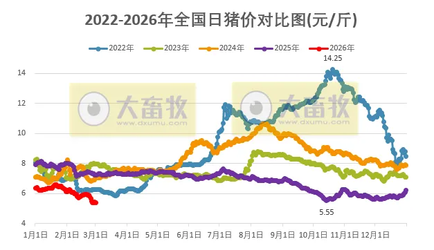 其中2022年同期在6元区间震荡上涨,2023-2025年这3年同期均在7元区间震荡,而今年2026年此时在5元区间震荡。