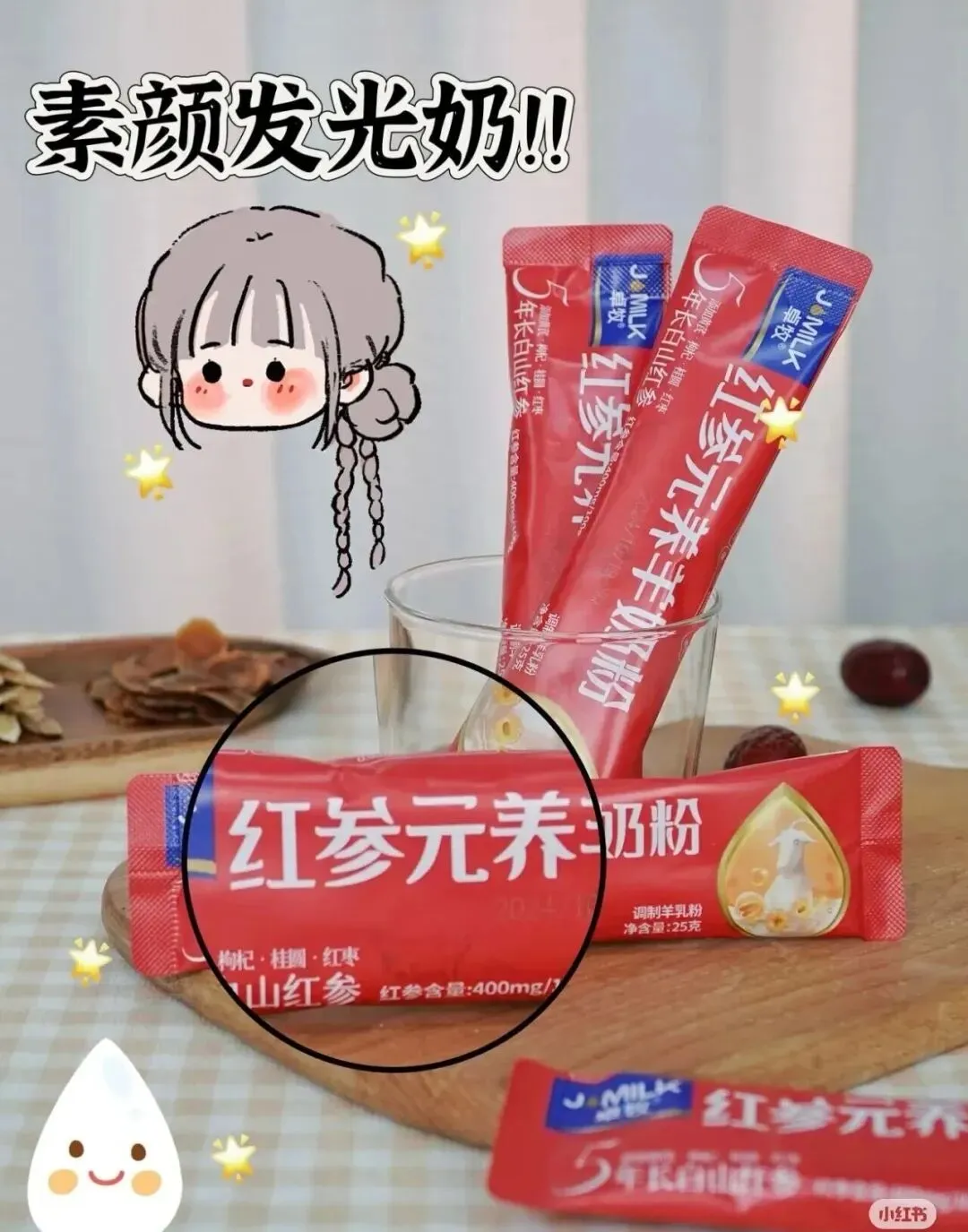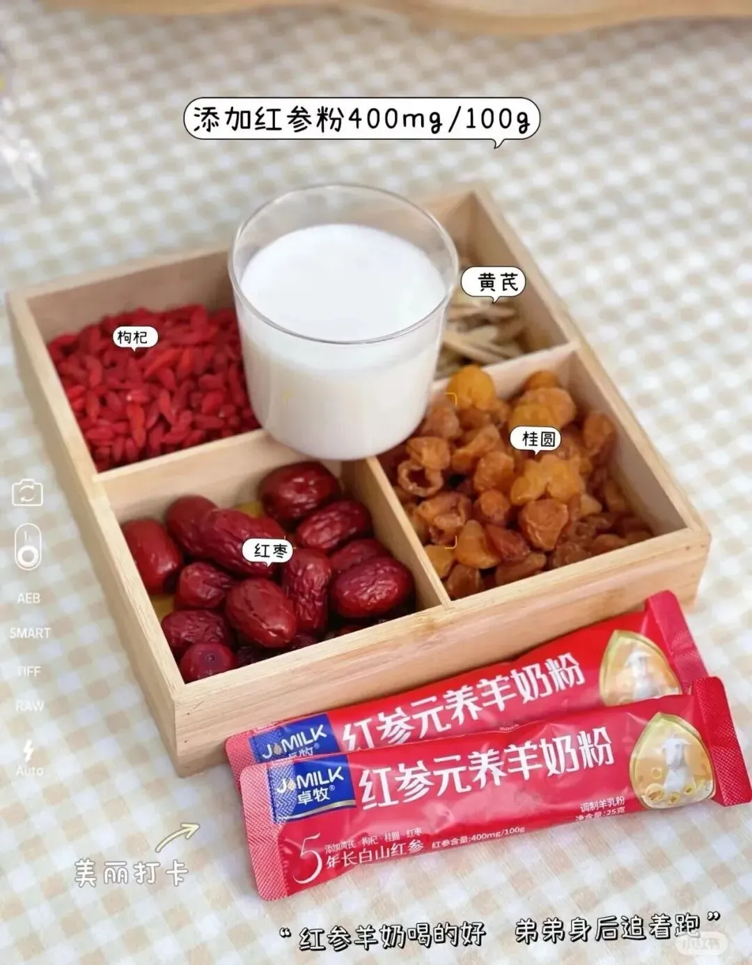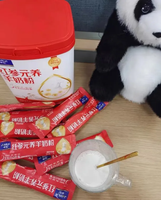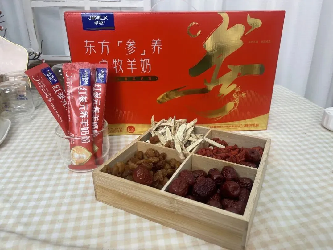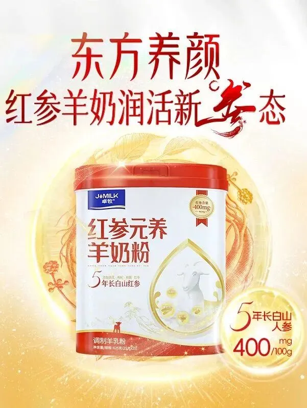 原料选自五年长白山红参,地理标志产品 ; 五种食补协调,红参/黄芪/枸杞/红枣/桂圆; ≥95%生羊乳羊奶,天然A2蛋白,亲和人体少负担; 特有EGF生长因子,肌肤健康白润; 高钙高蛋白,国家高钙标准的五倍; 精选生羊乳,80项品质监测,闪蒸物理脱膻,喷雾干燥成粉,奶香浓郁~