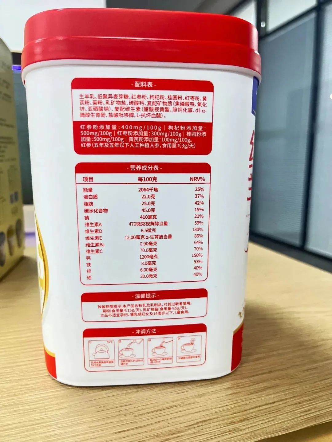 卓牧红参元养羊奶粉 钙含量1200mg/100g,是国际高钙标准的五倍 高蛋白含量22g/100g 女人喝脸色红润有光泽 老人喝走路更硬朗,身体更健康
