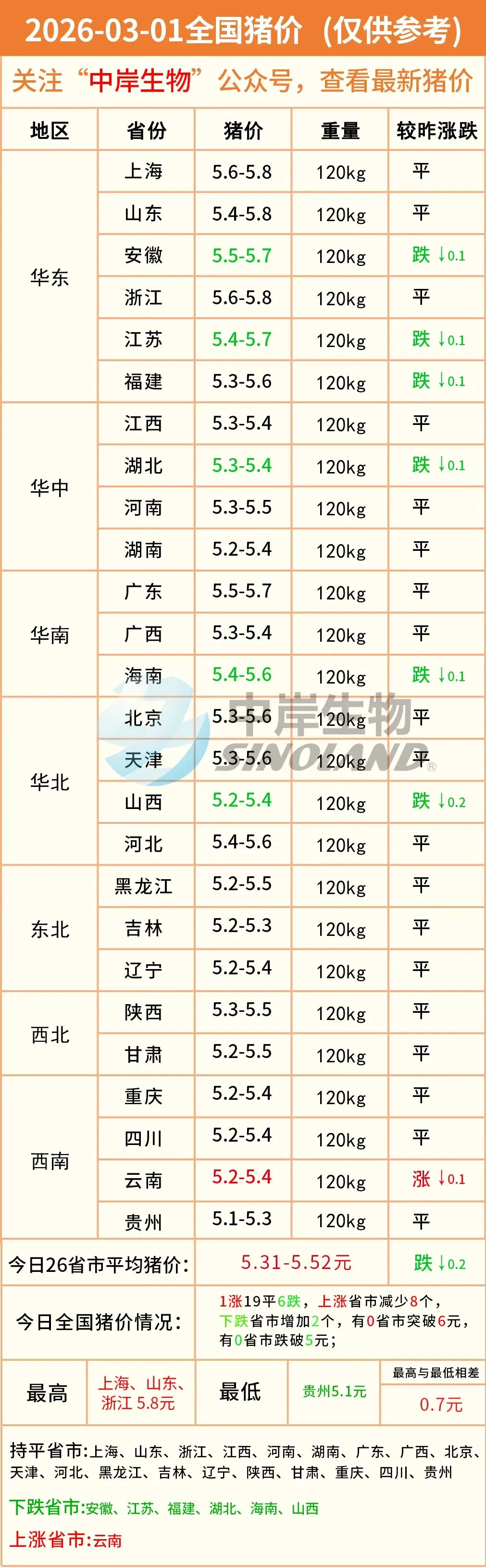 明日猪价|2026-03-01全国最新猪价(猪价已更新!) 养羊网 2026-02-28 明日猪价|2026-03-01全国最新猪价(猪价已更新!)营销中心丨0731-83806009技术服务丨0731-83806019 养羊网 2026-02-28 上一篇:【明日猪价】3月1日猪价稳涨跌均有 下一篇:明日猪价3月1日 您可能还会对下面的文章感兴趣111: 相关文章 猪价大预测】2月11~2月15日!全国猪价大 我心中的飞鼠毕业套o(`ω? )o 近期价格更新!!! 腊月猪价连跌15天,南方养殖户连夜抛售,春节前还能涨回来吗?