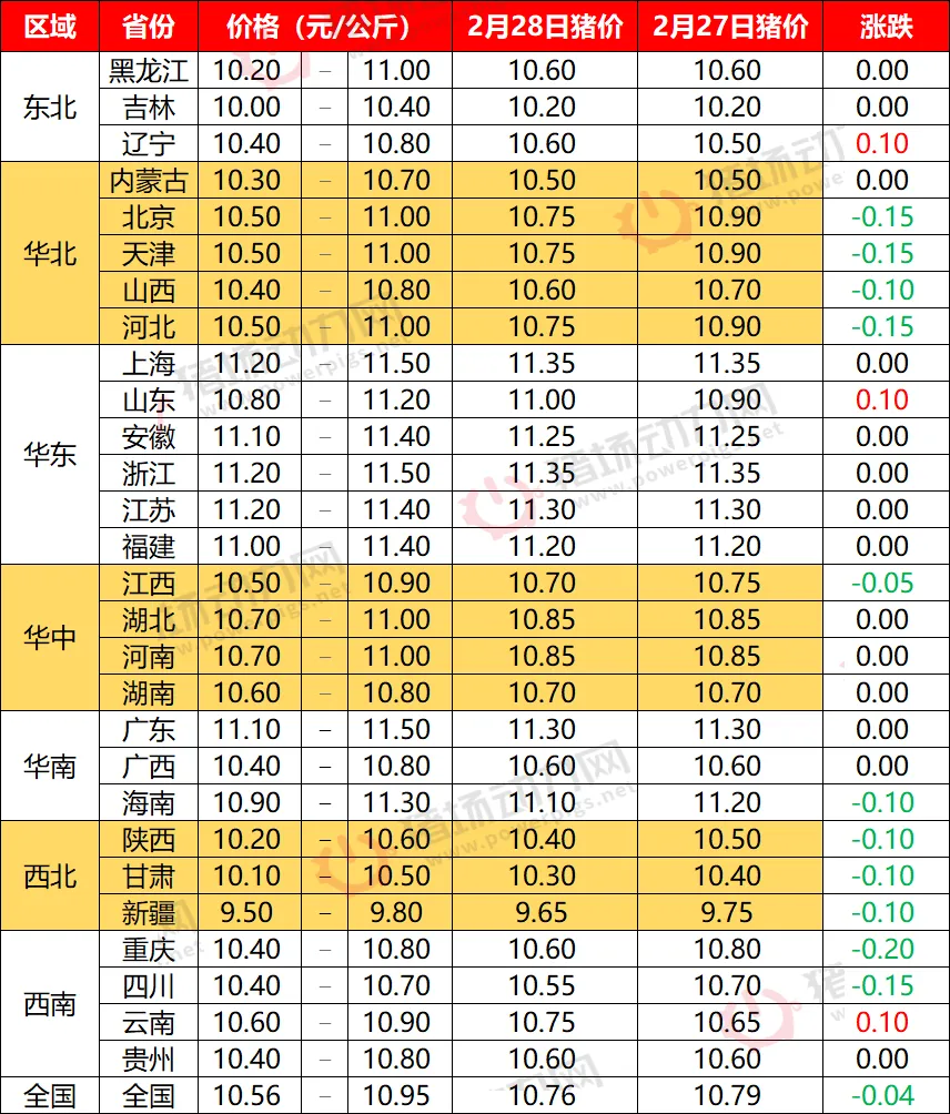 2月28日全国猪价偏弱下跌,华北、西北领跌【动力猪价】