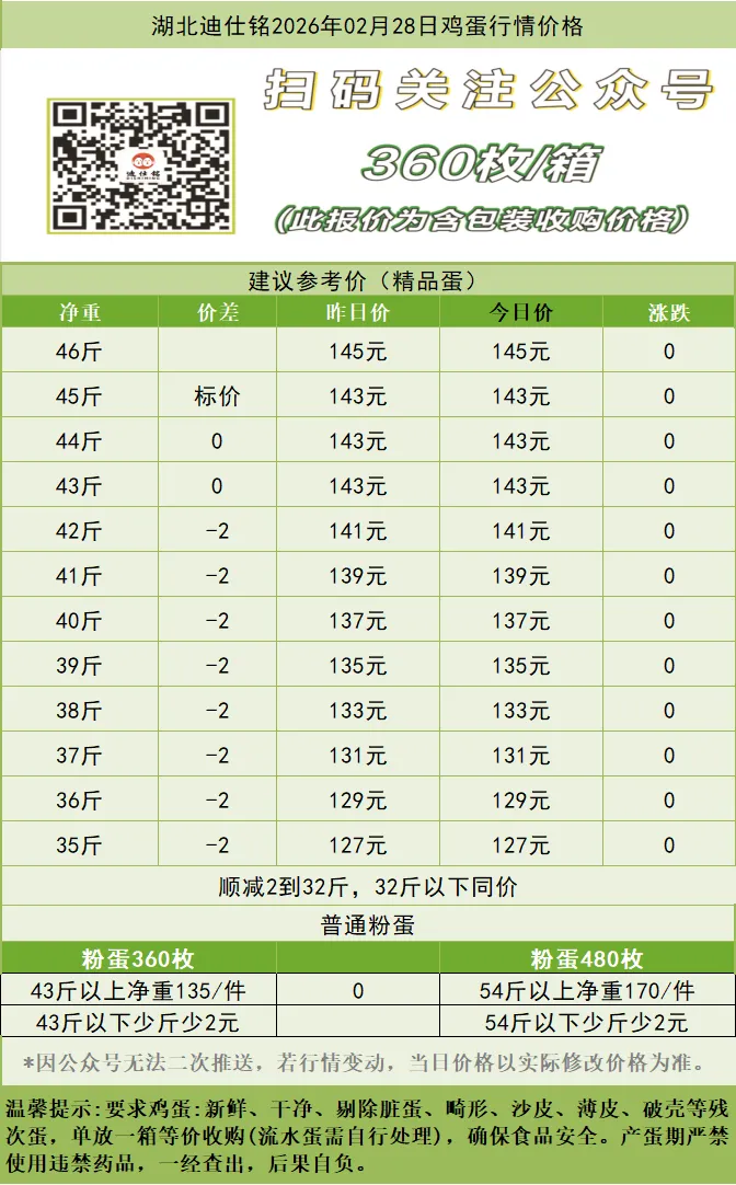 湖北迪仕铭2026年02月28日鸡蛋行情价格 养羊网 2026-02-28 湖北迪仕铭2026年02月28日鸡蛋行情价格 养羊网 2026-02-28 上一篇:【明日 猪价】 2026. 03. 01 上涨昙花一现!猪价一夜生变!!!!!!?!!!!?! 下一篇:【明日猪价】跌涨调整!大部平稳! 您可能还会对下面的文章感兴趣111: 相关文章 近期价格更新!!! 【猪价早讯】 2026. 1.15猪价!多地继续冲高!涨!(欢迎转发) 2025年4月13日全国各地生猪价格信息 捡回来养的小羊,现在走到哪跟到哪…