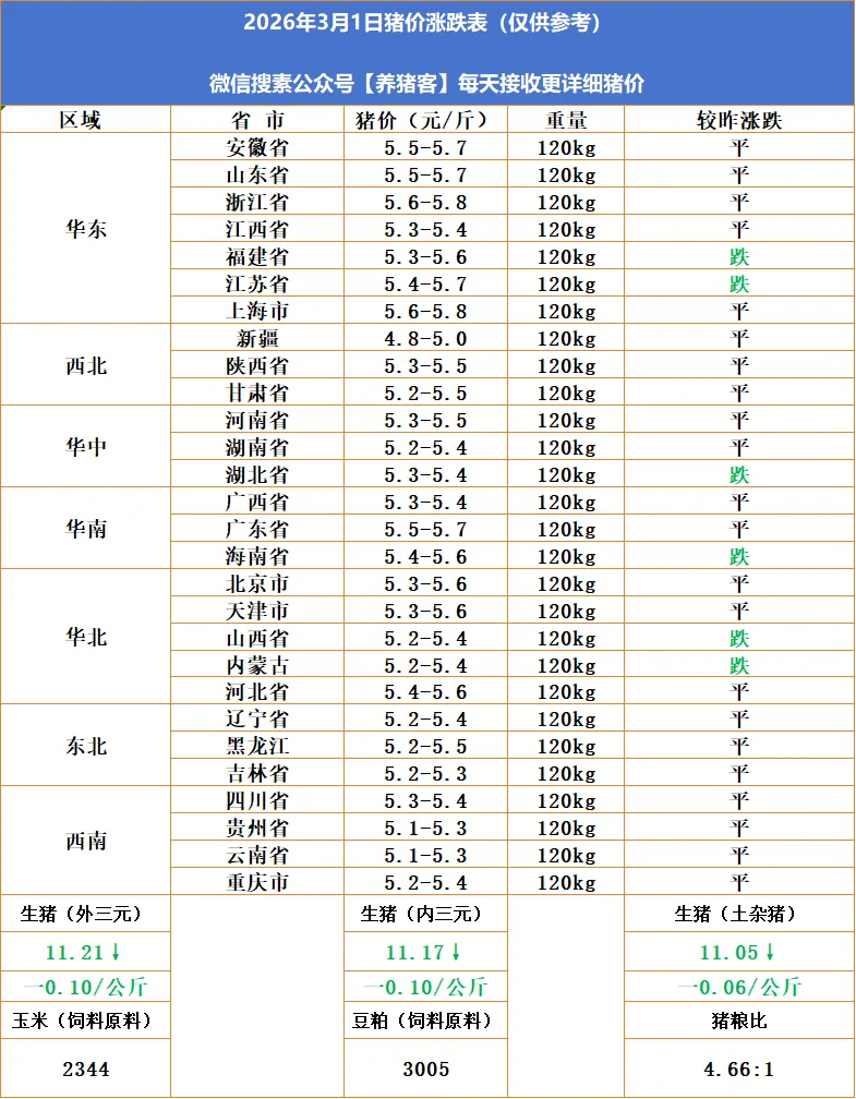 养猪客|2026.3.1|明天猪价分析(只供参考) 养羊网 2026-02-28 养猪客|2026.3.1|明天猪价分析(只供参考) 养羊网 2026-02-28 上一篇:2026-3-1 屠企报价( 猪价趋向稳定!) 下一篇:2026/3/1猪价参考信息及养殖知识(猪育肥口诀:一驱、二加、三防、四改、五查、六净!) 您可能还会对下面的文章感兴趣111: 相关文章 2025年4月13日全国各地生猪价格信息 2025年4月13日全国各地生猪价格信息 2026. 02. 26 全国猪价! 黄冈市巴马香猪的价格