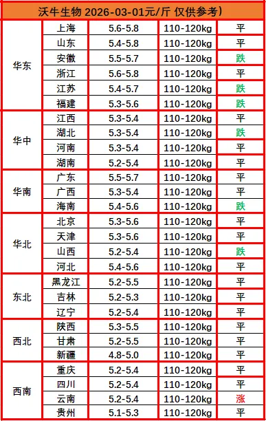 ? ?猪价播报沃小牛,助力养猪牛牛牛!各位养猪的老铁们,大家好!我是沃小牛,明天是2026年03月01日,最新猪价已经出来了:明天全国猪价没有“暖”起来,止涨企稳状态。整体呈现“窄幅横盘、局部微跌”的态势。上海、浙江、广东等沿海地区主流价维持在5.5-5.8元/斤,河南、山东、河北等主产区稳定在5.3-5.6元/斤,云南则有微弱上涨。屠宰企业开工率仍处低位,白条走货缓慢,终端消费疲软,养殖户出栏意愿分化,集团场稳价出栏,散户多持观望态度,市场缺乏明显的多空驱动,整体处于“磨底”阶段。