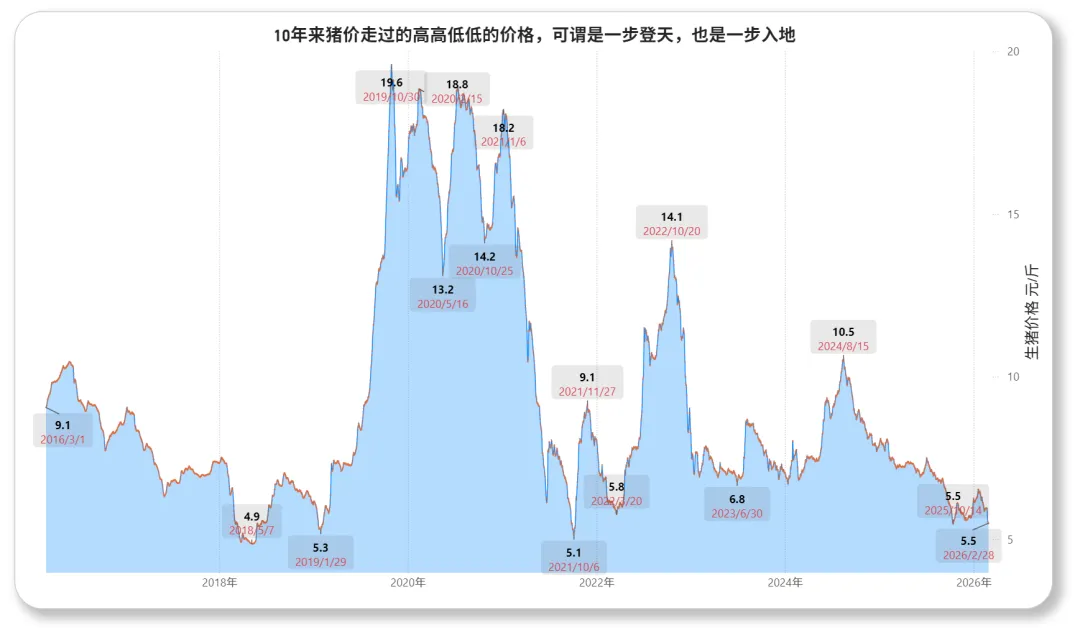 回顾一下十年来的走势,可以说是喜忧参半。有最低4.9时的无奈,也有19.6的时候的高歌。说没有养猪赚到钱的,估计不是不努力,大多是努力的方向错了。