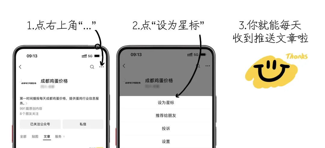 3月1日成都鸡蛋价格参考? 亲爱的鸡蛋行业粉丝朋友们,微信推送规则一直在变化,很多朋友们反馈不能第一时间收到鸡蛋报价。如果你仅仅是“关注”,很可能无法收到推送。按照下图操作点击“成鸡蛋价格”公众号名片,设为星标,就可以不错过每天的报价。