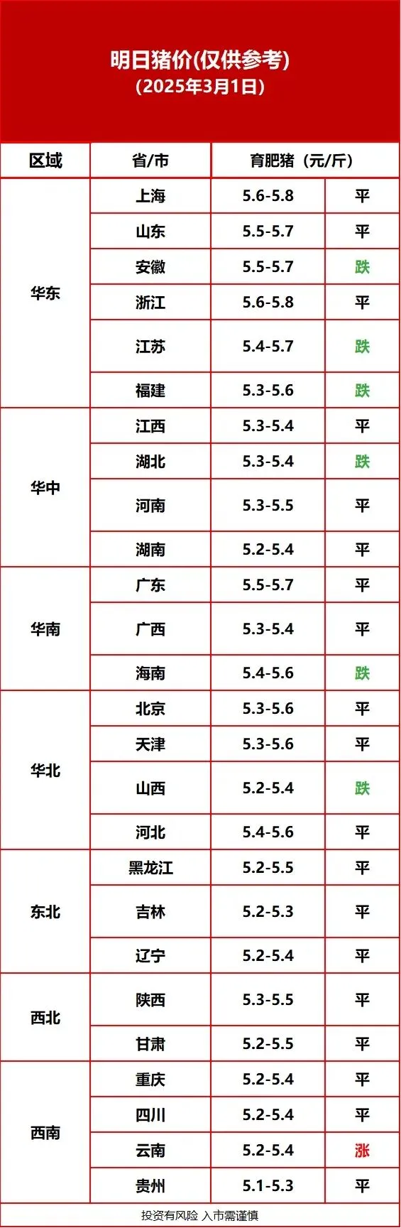 【今日猪价】2月29日全国猪价:部分地区价格调整,市场需求相对稳定 养羊网 2026-03-01 【今日猪价】2月29日全国猪价:部分地区价格调整,市场需求相对稳定 养羊网 2026-03-01 上一篇:3月1日广西鸡蛋价格参考 下一篇:3月1日贵阳鸡蛋价格参考 您可能还会对下面的文章感兴趣111: 相关文章 来自农业大省的安全感 【猪价】2026.01.18福建各地区每日最新猪价 2024年还有谁被骗1800 工作室作品-能源与游牧——乌兰巴托游牧景观