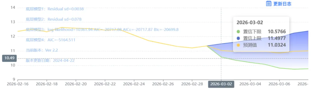 玄田算法是由项目课题组团队原创的非经典逻辑数值聚合理论和不确定性预测方法,构建了基于一致模算子的生猪价格预测模型。该模型采用的聚合函数及一致模相关理论与方法已获得多项国家自然科学基金和省级自然科学资金资助,并获得多项省级自然科学奖奖项。03月02日预测猪价为11.0324,置信区间在10.5766--11.4977之间。03月03日预测猪价为10.9704;03月04日预测猪价为10.9692。
