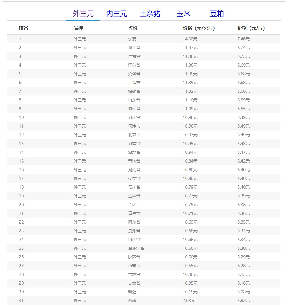 全国外三元生猪价格排行榜