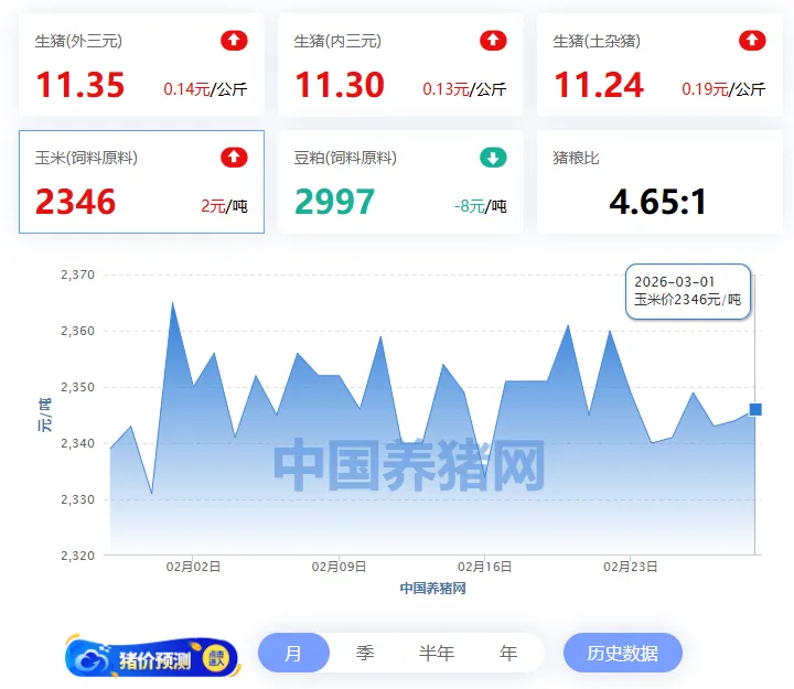 2026年03月01日-中国养猪网 全国玉米价格走势图及涨跌表