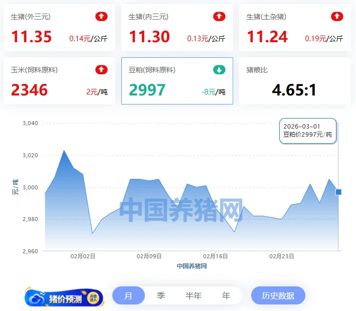 2026年03月01日-中国养猪网 全国豆粕价格走势图及涨跌表