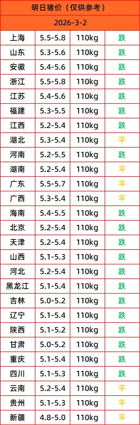 明日猪价(仅供参考) 2026/3/2 上海 5.5-5.8 110kg 跌 山东 5.3-5.6 110kg 跌 安徽 5.4-5.6 110kg 跌 浙江 5.5-5.8 110kg 跌 江苏 5.4-5.6 110kg 跌 福建 5.3-5.5 110kg 跌 江西 5.2-5.4 110kg 跌 湖北 5.3-5.4 110kg 平 河南 5.2-5.5 110kg 跌 湖南 5.2-5.4 110kg 平 广东 5.5-5.7 110kg 平 广西 5.3-5.4 110kg 平 海南 5.4-5.5 110kg 跌 北京 5.2-5.4 110kg 跌 天津 5.2-5.4 110kg 跌 山西 5.1-5.3 110kg 跌 河北 5.2-5.4 110kg 跌 黑龙江 5.1-5.4 110kg 跌 吉林 5.0-5.2 110kg 跌 辽宁 5.1-5.4 110kg 跌 陕西 5.1-5.2 110kg 跌 甘肃 5.0-5.2 110kg 跌 重庆 5.1-5.4 110kg 跌 四川 5.1-5.3 110kg 跌 云南 5.2-5.4 110kg 平 贵州 5.1-5.3 110kg 平 新疆 4.8-5.0 110kg 平